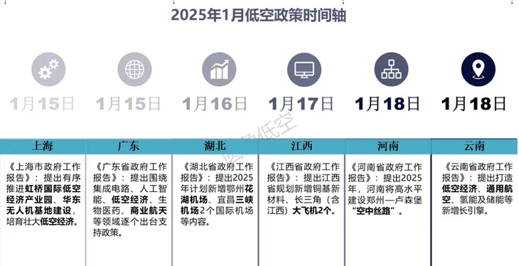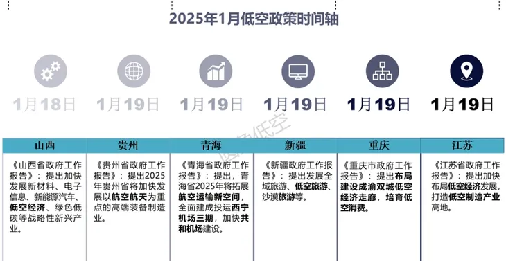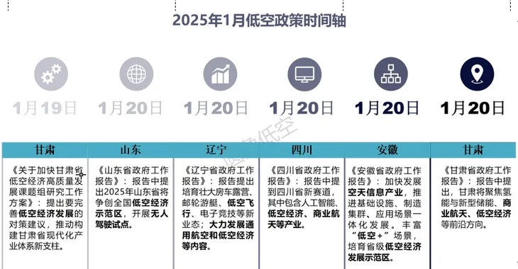 趋势:第一,政策密集落地。2025年1月成为低空经济政策“发布窗口期”,各省份明确时间表与量化目标,如吉林推进通用机场建设。第二,多产业融合。低空经济与人工智能、新能源、商业航天等领域交叉,催生新业态,如重庆“低空消费”、辽宁“低空飞行+电竞”。