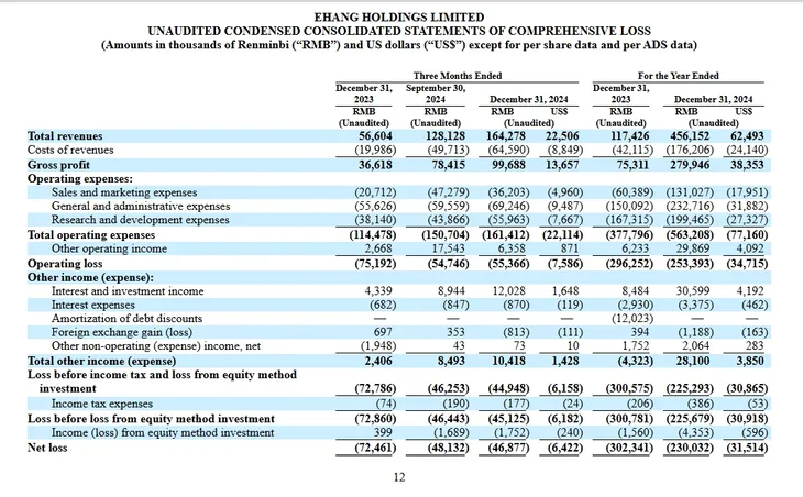 2024年3月12日,亿航智能(NASDAQ: EH)公布了截至2024年12月31日的2024财年第四季度及全年未经审计财务业绩报告。数据显示,公司在无人驾驶航空器交付量、收入及盈利能力等方面均实现显著突破,商业化进程进一步提速。