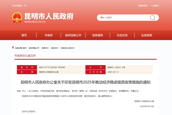3月12日,昆明市人民政府办公室印发《昆明市2025年推动经济稳进提质政策措施》(以下简称《措施》),该政策聚焦于激发消费潜力、扩大有效益的投资、推动产业提质升级等8个方面,明确提出26条具体举措。