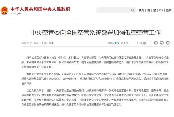 据新华社4月7日报道,为保障通用航空和低空经济高质量发展,中央空管委印发专项措施,重点围绕健全低空管理体系、优化空域资源配置、提升运行服务质效、夯实基础支撑能力、强化依法管空用空等方面,向全国空管系统部署加强低空空管工作。