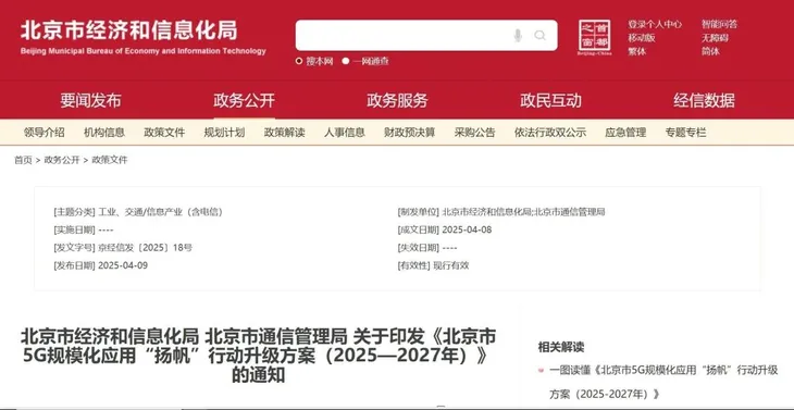 4月9日,北京市经济和信息化局联合北京市通信管理局发布关于印发《北京市5G规模化应用“扬帆”行动升级方案(2025—2027年)》的通知,明确未来三年5G发展蓝图,全力打造国内领先的5G应用标杆城市。