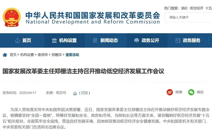 4月17日,国家发展改革委发布《国家发展改革委主任郑栅洁主持召开推动低空经济发展工作会议》,明确要坚持“全国一盘棋”,统筹好发展和安全、政府和市场、当前和长远等方面关系,谋划编制好低空经济发展“十五五”相关规划,全面筑牢安全底线,营造良好发展环境,因地制宜推动低空经济安全健康发展。中央和国家机关有关部门、中央军委有关部门负责同志出席会议。