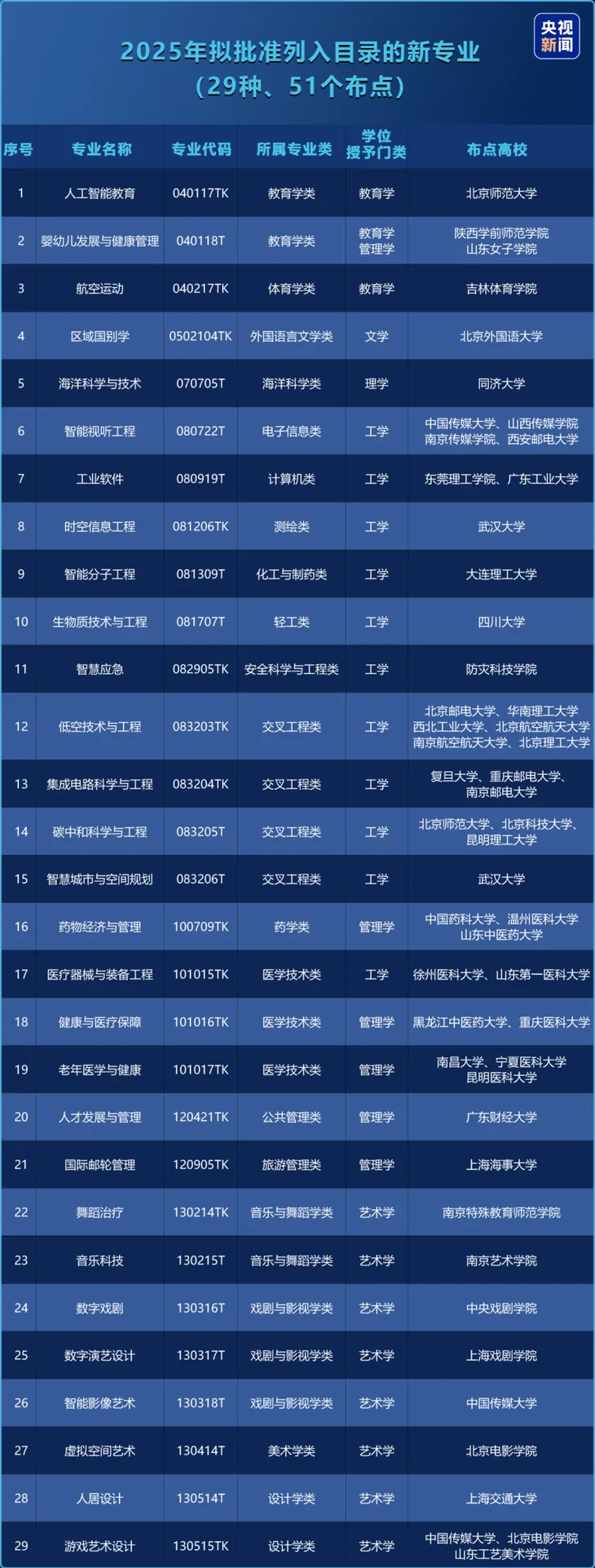 4月22日,教育部更新发布《普通高等学校本科专业目录(2025年)》,增列29种新专业,纳入 2025 年高考招生。新目录包含93个专业类、845种专业,进一步强化专业设置对国家战略急需和高质量发展的快速响应。