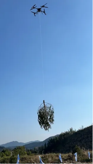福建南平国有林场内,数十公斤重的苗木在无人机的牵引下稳稳升空
