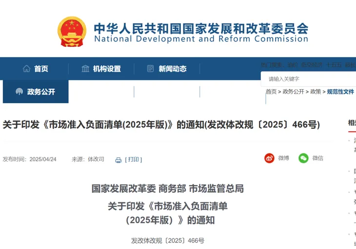 4月24日,国家发展改革委、商务部、市场监管总局联合对外发布《市场准入负面清单(2025年版)》