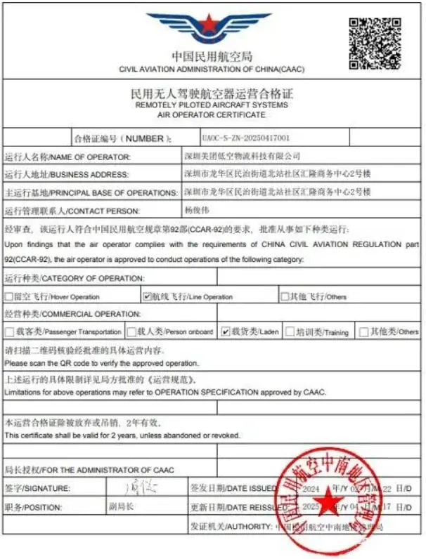 民用无人机运营合格证核发首次被纳入负面清单;美团无人机拿下首张OC证 | 本周速递