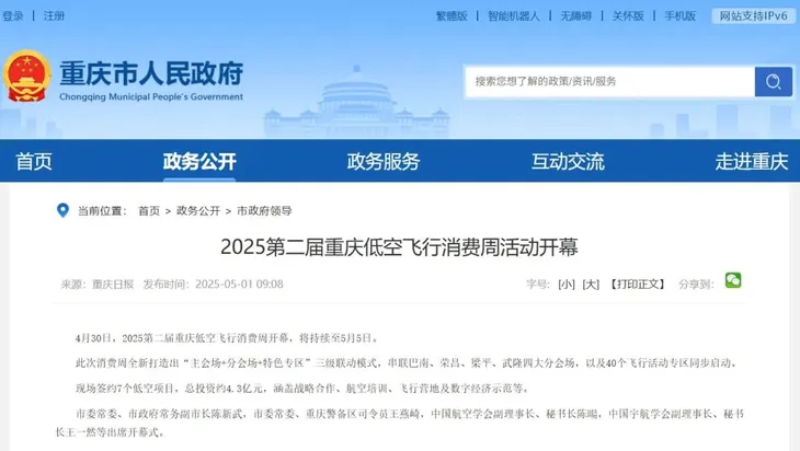4月30日,2025第二届重庆低空飞行消费周开幕,本届消费周以 “低空瞰山城 消费新未来” 为主题,一直持续到五一结束。