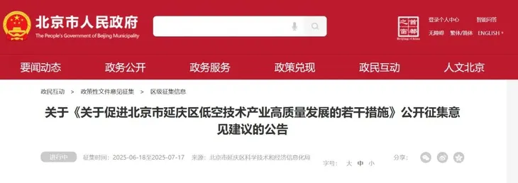 6月18日,北京市延庆区科信局就《关于促进北京市延庆区低空技术产业高质量发展的若干措施》(简称《若干措施》)公开征集意见。公开征集意见时间为2025年6月18日—2025年7月17日。
