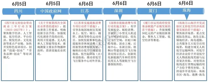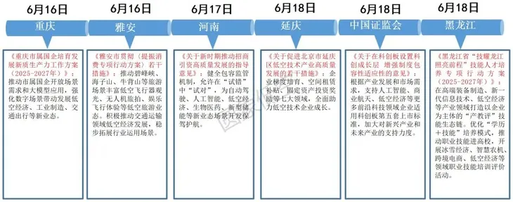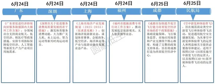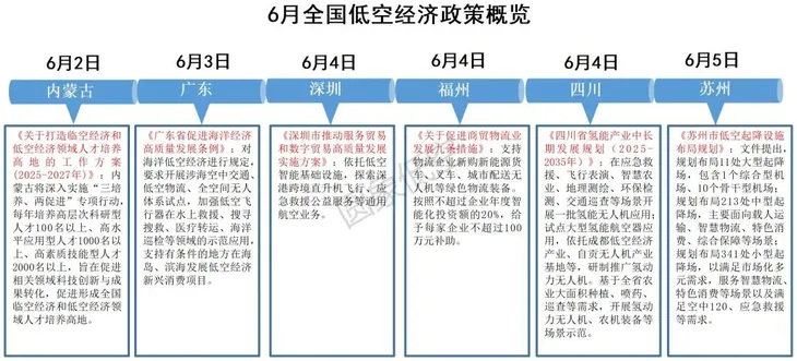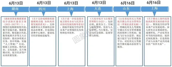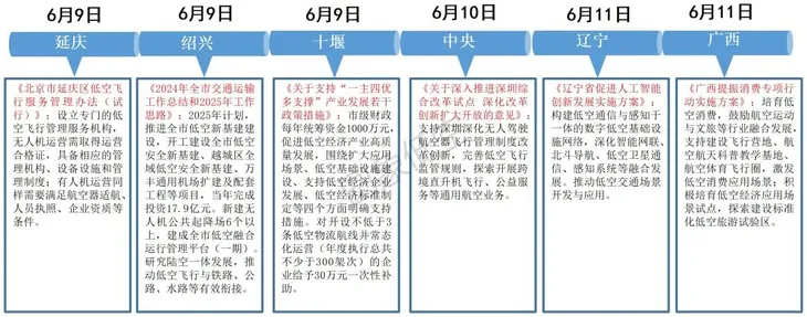 为了更清晰地展现 6 月份低空政策的全貌,我们精心梳理并绘制以下的低空政策时间轴,并形成了相应的政策报告。