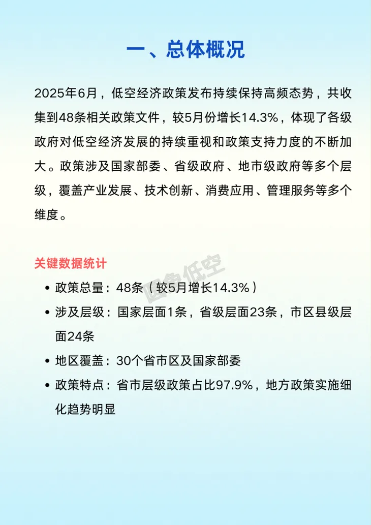 低空领域作为一片充满无限潜力的新兴空间,正日益成为推动经济发展、科技创新以及拓展人类活动边界的关键领域。在刚刚过去的 6 月份,全国各地积极响应时代发展的浪潮,纷纷出台了一系列具有前瞻性和针对性的低空政策,为低空经济的蓬勃发展注入了强大动力。