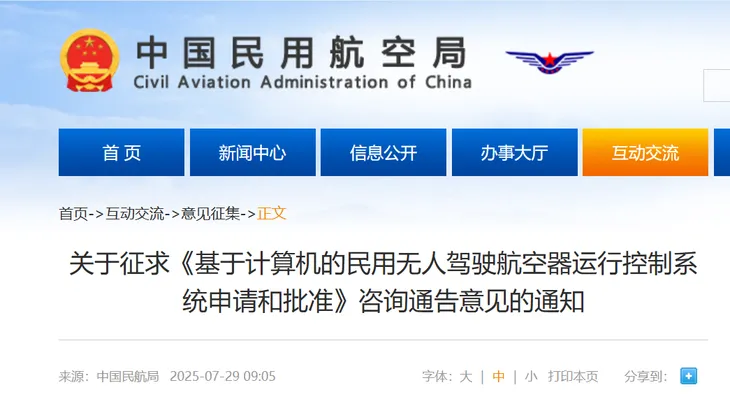 中国民用航空局近日发布征求意见通知,就《基于计算机的民用无人驾驶航空器运行控制系统申请和批准》咨询通告向社会公开征求意见,截止时间为2025年8月15日。这一新规旨在进一步规范民用无人驾驶航空器运行,固化前期无人机云系统试运行成果经验,确保管理理念和政策与技术发展相适应。