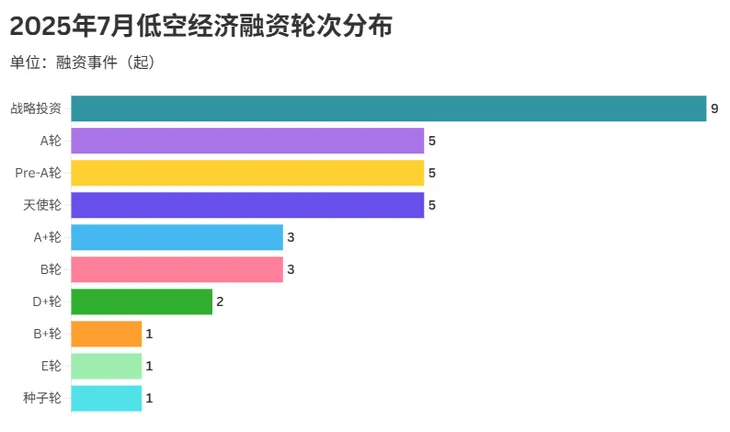 2025年7月低空经济融资动态呈现鲜明轮次特征。数据显示,战略投资以9起融资事件领跑,成为当月低空经济领域资本聚焦的关键轮次,反映出行业头部整合、生态构建等战略布局动作频繁,企业借助战略投资加速资源协同与业务拓展。