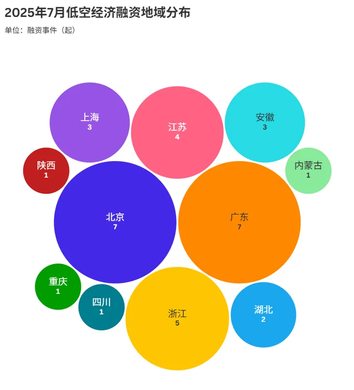 2025年7月,低空经济融资地域格局清晰显现。北京、广东以7起融资事件并列领跑,凭借产业资源集聚、科创生态完善等优势,成为低空经济资本高地,持续吸引创新项目与资金流入,引领行业发展方向。