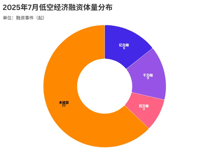 2025年7月低空经济融资体量数据发布,展现出行业内资本活跃且多元的投入态势。在已披露的融资事件中,“亿元级”与“千万级”融资均达5起,“百万级”融资为3起,不同量级资金在低空经济领域多点开花,彰显资本对该行业全方位的关注与支持。