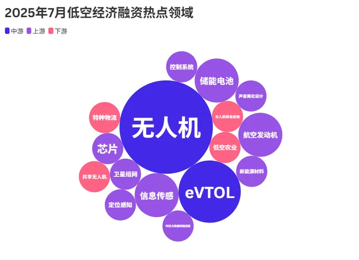 2025年7月,低空经济融资热点领域图谱显现清晰脉络。无人机与eVTOL(电动垂直起降飞行器)成为核心聚焦点,凸显其在低空经济生态中的关键地位。