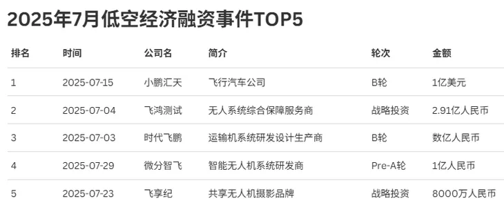 2025年7月,低空经济融资热度持续,融资事件TOP5揭晓行业投资风向,榜单前四融资金额均达亿元级。小鹏汇天作为飞行汽车公司,于7月15日完成B轮1亿美元融资,凭借创新品类抢占低空交通新赛道。