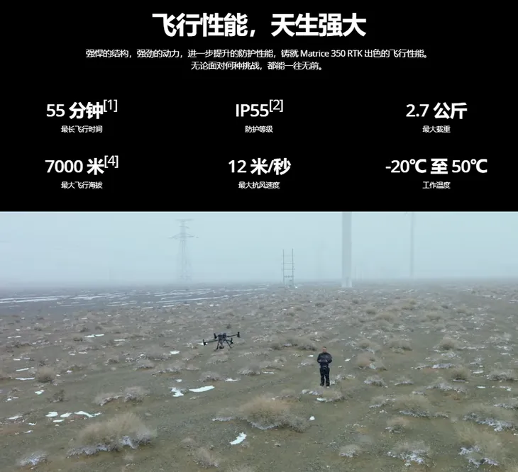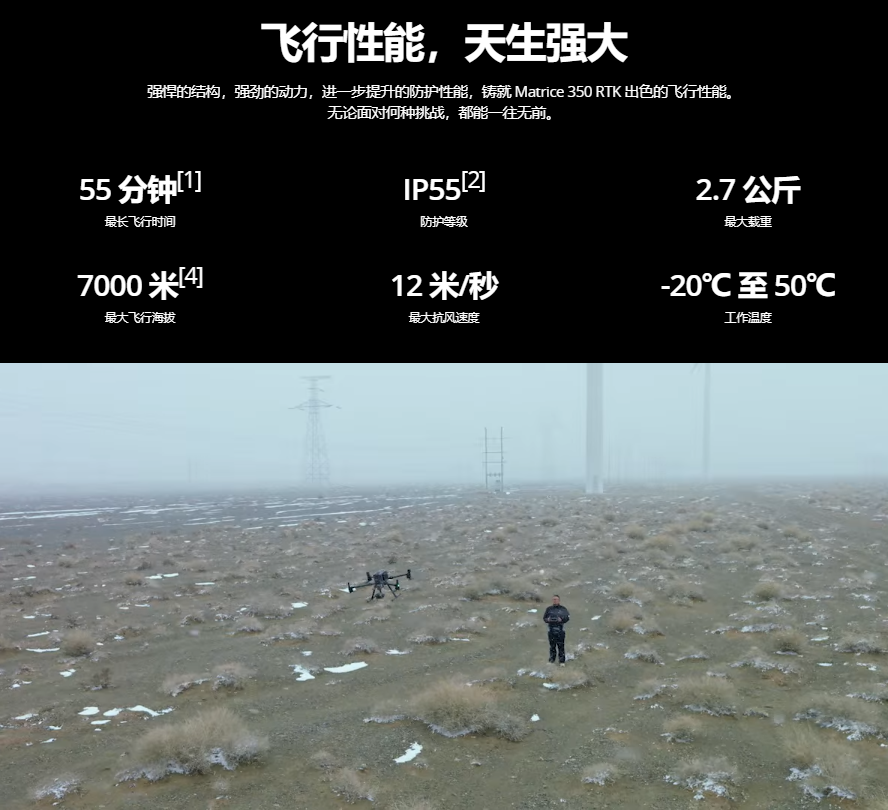 大疆经纬M350 RTK作为目前大疆行业性能较强的旗舰飞行平台,技术参数亮眼:拥有55分钟续航时间,最高飞行高度达海拔7000米,抗风能力达12米/秒,支持IP55防护等级,可在-20℃至50℃环境中工作,最多可同时搭载三个负载,载重达2.7公斤。