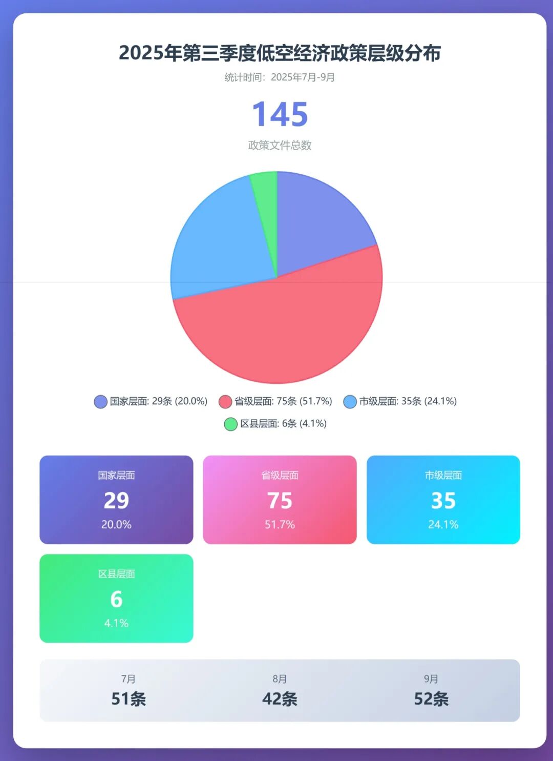 从时间分布看,7月发布51条政策,8月受政策调整期影响略有回落至42条,9月政策发布力度再次加强达到52条,整体呈现出政策持续推进、节奏稳健的特点。三个月的政策发布量保持在相对均衡的水平,月均48条,体现出政策推进的连续性和稳定性。