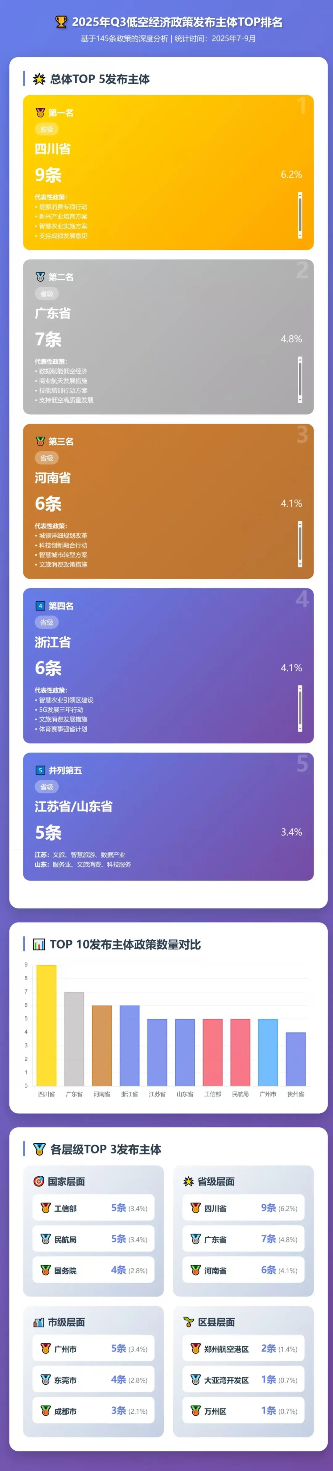 从各层级发布的政策总数来看,发布政策最多的是省级。四川省以9条政策位居榜首,占全国政策总数的6.2%,涵盖消费促进、产业发展、农业应用、基础设施建设、智慧农业等多个领域,展现出全面推进低空经济发展的战略布局。广东省紧随其后发布7条政策,占比4.8%,政策内容聚焦数据赋能、商业航天、消费提振、城市数字化转型等前沿领域,体现出创新引领和技术驱动的发展思路。