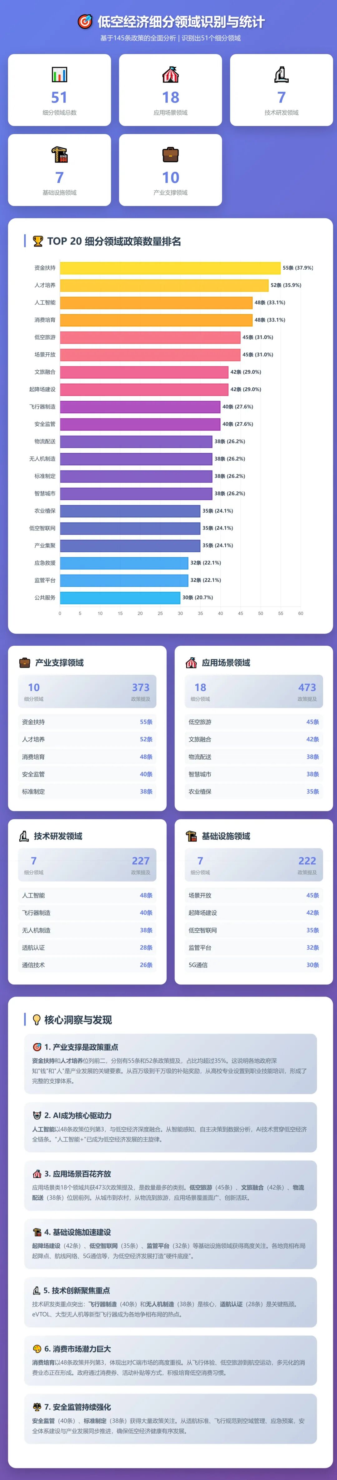 通过对51个细分领域的政策提及频次分析,清晰勾勒出三季度低空经济政策的 “重点方向” 与 “资源倾斜” 特征,揭示行业发展的核心发力点。