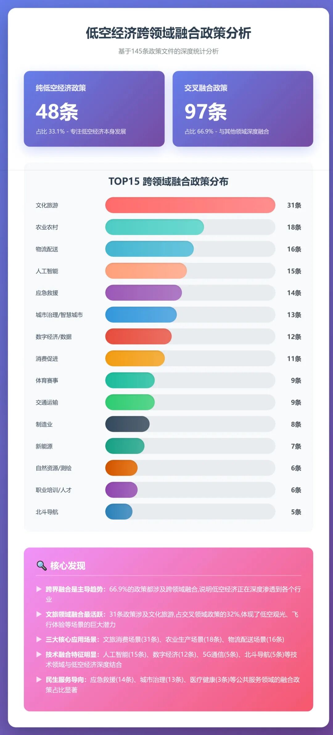 通过对145条政策的交叉分析,揭示了三季度低空经济 “跨界融合” 的显著特征,展现其作为 “产业赋能工具” 的广泛价值。