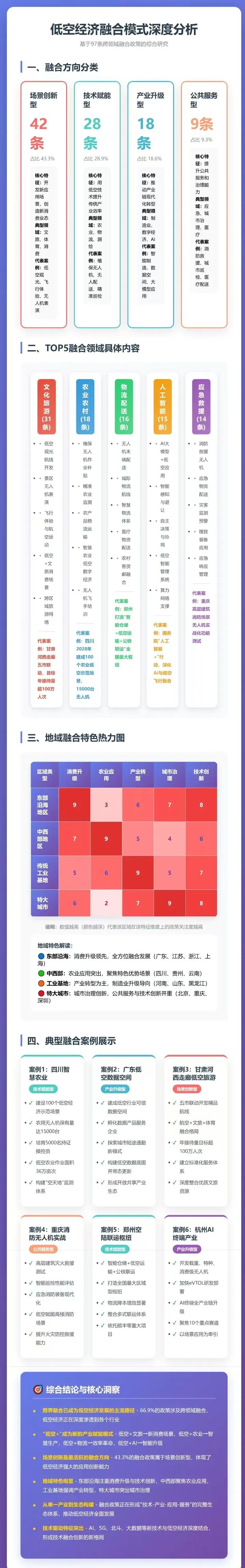 最后,从地域融合特色热力图看,不同区域基于资源禀赋形成差异化路径:东部沿海地区侧重消费升级(9项政策)与技术创新(8项政策),如深圳、东莞聚焦低空智能制造与消费场景开发;中西部地区深耕农业应用(9项政策)与公共服务(7项政策),如四川、贵州拓展农村低空场景与应急救援应用;传统工业基地发力产业转型(9项政策),如辽宁、陕西推动低空装备制造升级;特大城市强化城市治理(9项政策),如北京、上海用低空技术提升城市管理效能。这种 “因地制宜” 的融合路径,既避免了同质化竞争,又最大化发挥了区域比较优势,为全国低空经济均衡发展提供了实践样本。