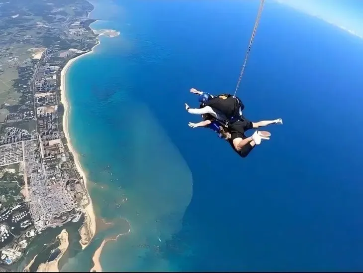 海南三亚,跳伞带跳教练带着游客跃出机舱