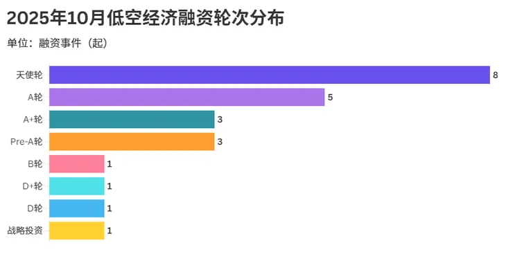 2025年10月,低空经济领域融资轮次分布呈现出早期项目主导、融资阶段多元的特点。数据显示,天使轮融资事件以8起的数量领跑各轮次,这表明低空经济赛道仍处于早期发展阶段,具有创新潜力的初创项目正持续获得资本关注,行业在技术研发、模式探索等前期布局环节热度较高。