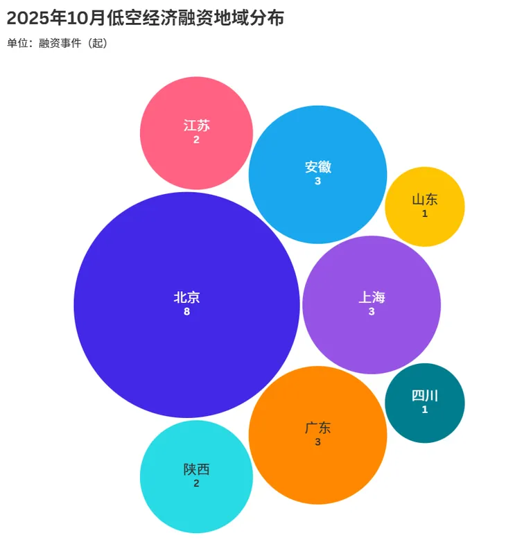 2025年10月,低空经济融资地域分布呈现出头部城市引领、多区域协同的发展态势。数据显示,北京以8起融资事件的绝对优势位居首位,凭借其在科技创新资源、产业政策支持以及资本聚集度等方面的突出优势,成为低空经济领域融资最活跃的核心区域,充分彰显了其在该赛道的引领地位。