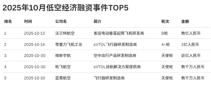 2025年10月,低空经济领域融资TOP5事件重磅出炉,eVTOL(电动垂直起降飞行器)赛道成为资本争夺的焦点,头部项目在融资轮次和金额上均展现出强劲势能。