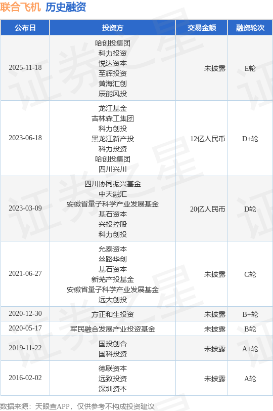 据悉,联合飞机此次E轮融资的参与投资机构包括哈创投集团、科力投资、悦达资本、至辉投资、黄海汇创、辰能风投,融资额未对外披露。联合飞机为工信部授予的“专精特新小巨人”企业,专业从事无人机等装备研发、生产和服务,拥有无人机全产业链研发服务能力,服务对象涵盖政府、军方及合作伙伴,业务聚焦无人机装备及整体解决方案提供,涉及国民经济和国家安全相关需求领域。