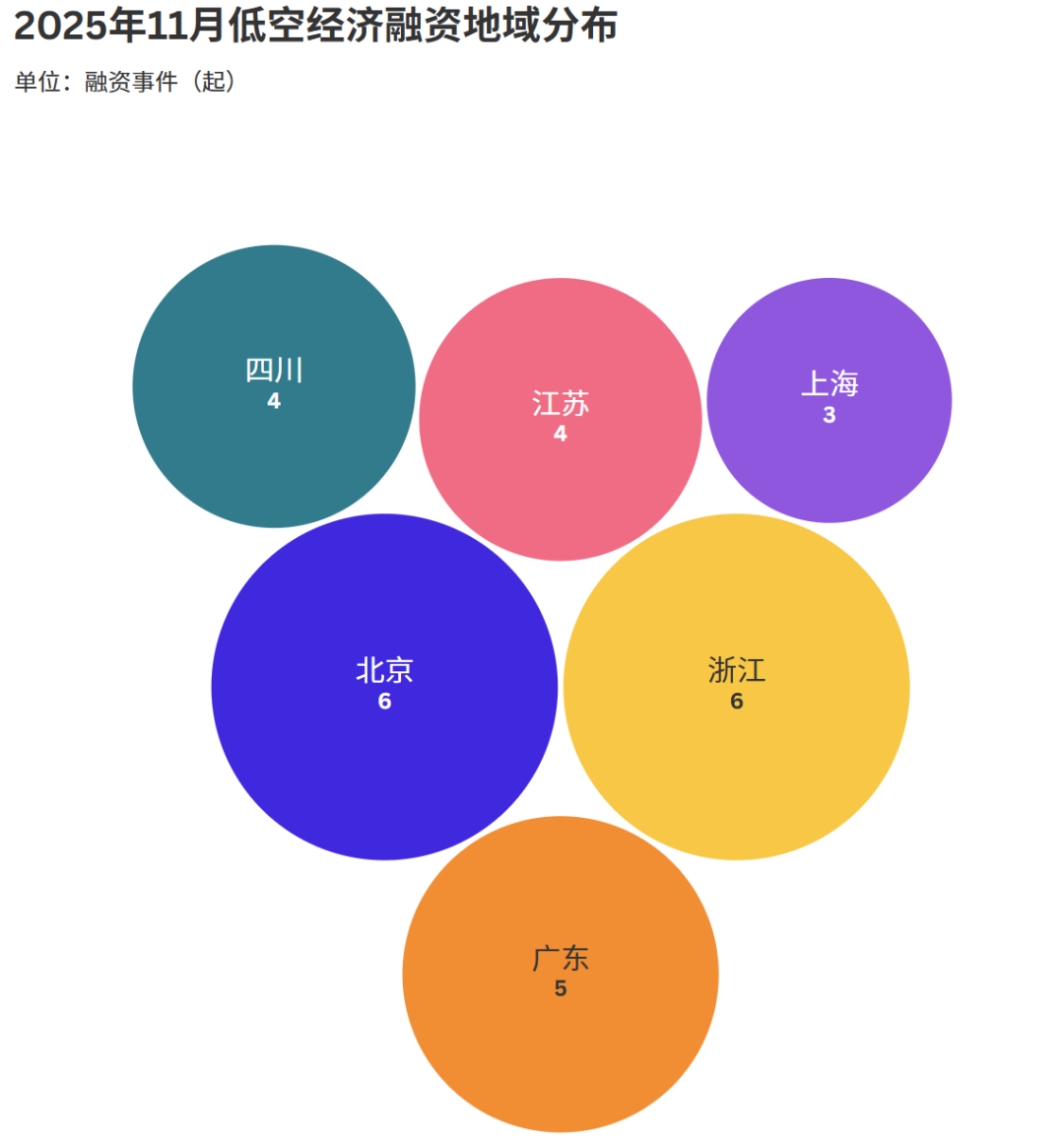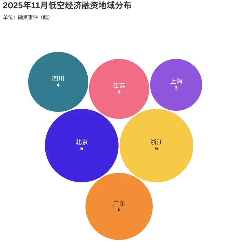 数据显示,北京、浙江以6起融资事件并列成为本月低空经济最活跃区域,合计占据当月总融资量的近三成。作为全国科创资源与产业政策高地,北京在低空经济的技术研发、企业孵化端优势突出;浙江则依托民营经济活力与无人机、低空物流等场景落地基础,成为商业化项目的聚集地。