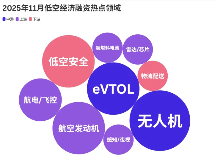 2025年11月低空经济融资热点领域数据显示,中游装备制造主导资本流向,同时上下游环节的技术与场景需求同步升温。