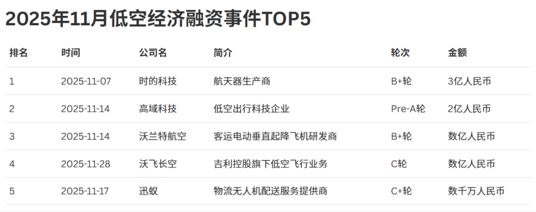 2025年11月低空经济融资事件TOP5榜单显示,载具研发与场景落地类项目占据主导,头部企业已进入资本密集型扩张阶段。
