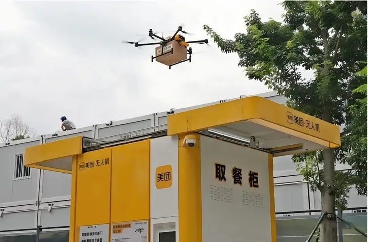 与此同时,上海互联宝地杨浦园的写字楼间,无人机在取餐柜上方起落繁忙。这里的3条配送航线覆盖周边高校与园区,4公里左右的配送距离,无人机不到10分钟就能完成,基本实现15分钟内送达,热咖啡、生煎包等时效性商品在配送中能最大程度保留最佳状态,为白领群体带来了全新的即时消费体验。