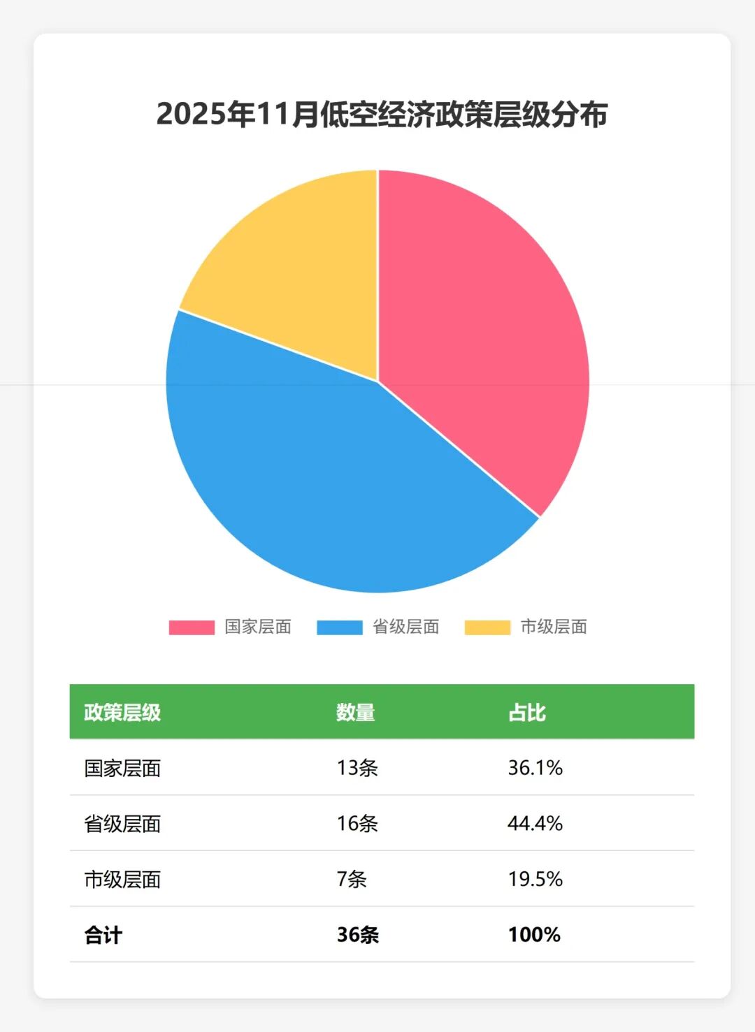 2025年11月低空经济政策发布呈现层级分明、主体多元的特征,三级政策协同发力推动产业发展。从层级分布来看,36条政策中省级层面16条,占比44.4%,成为政策输出的核心层级;国家层面13条,占比36.1%,发挥顶层设计和宏观引导作用;市级层面7条,占比19.5%,聚焦具体场景落地和区域特色发展。这种“省级主导、国家引领、市级落实”的格局,既保证了政策的统一性,又兼顾了地方灵活性。