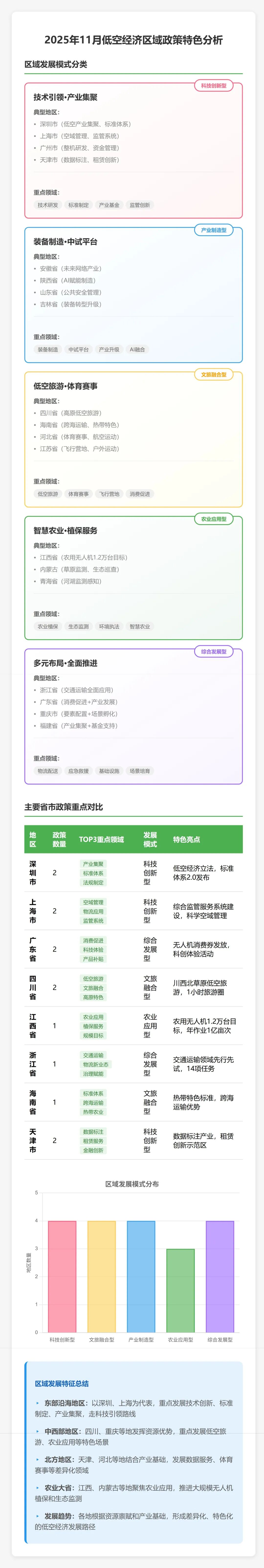 全国低空经济形成五大区域发展模式,各地依托资源禀赋和产业基础,走出差异化发展路径。科技创新型模式以深圳、上海、天津为代表,聚焦技术研发、标准制定和产业集聚,深圳发布低空经济标准体系2.0,上海推进综合监管服务系统建设,体现技术引领特征;文旅融合型模式集中在四川、海南、河北等地,开发低空旅游、体育赛事等场景,四川打造1小时低空旅游圈,海南突出热带农业和跨海运输特色;农业应用型模式以江西、内蒙古为核心,江西提出2028年农用无人机保有量1.2万台的目标,内蒙古推动无人机在生态执法中的应用;产业制造型模式聚焦广东、陕西等地,强化装备制造和AI赋能;综合发展型模式以浙江、重庆为代表,全面布局物流、应急、基础设施等领域。