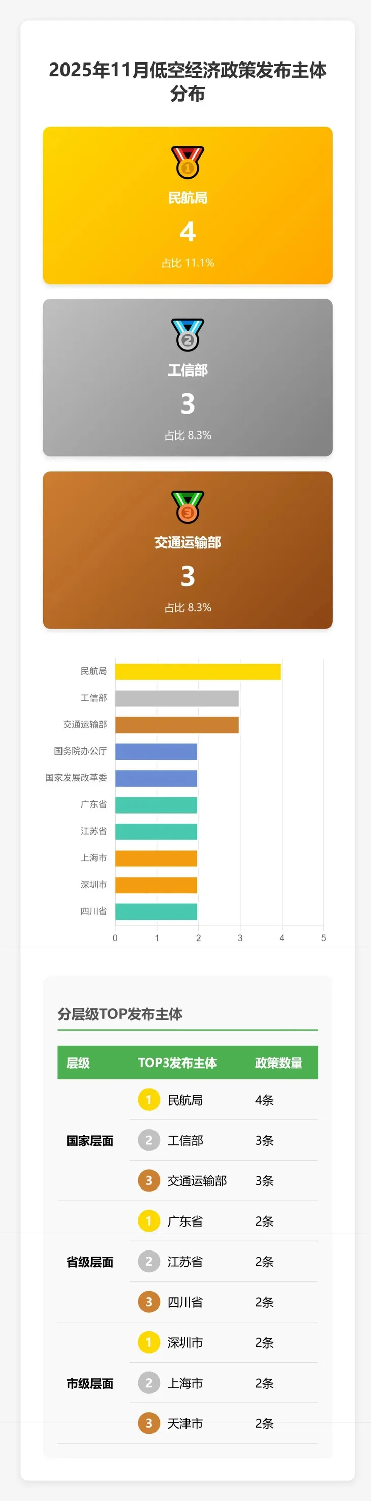 发布主体方面,国家层面民航局以4条政策领跑,工信部和交通运输部分别以3条政策并列第二,三者合计占国家层面政策的76.9%,成为国家层面政策制定的核心力量。地方层面,广东省、江苏省、四川省等6个省/市各发布2条政策,形成地方政策的主要支撑。多部门、多地区的广泛参与,体现了低空经济作为新兴产业的综合属性和发展热度。
