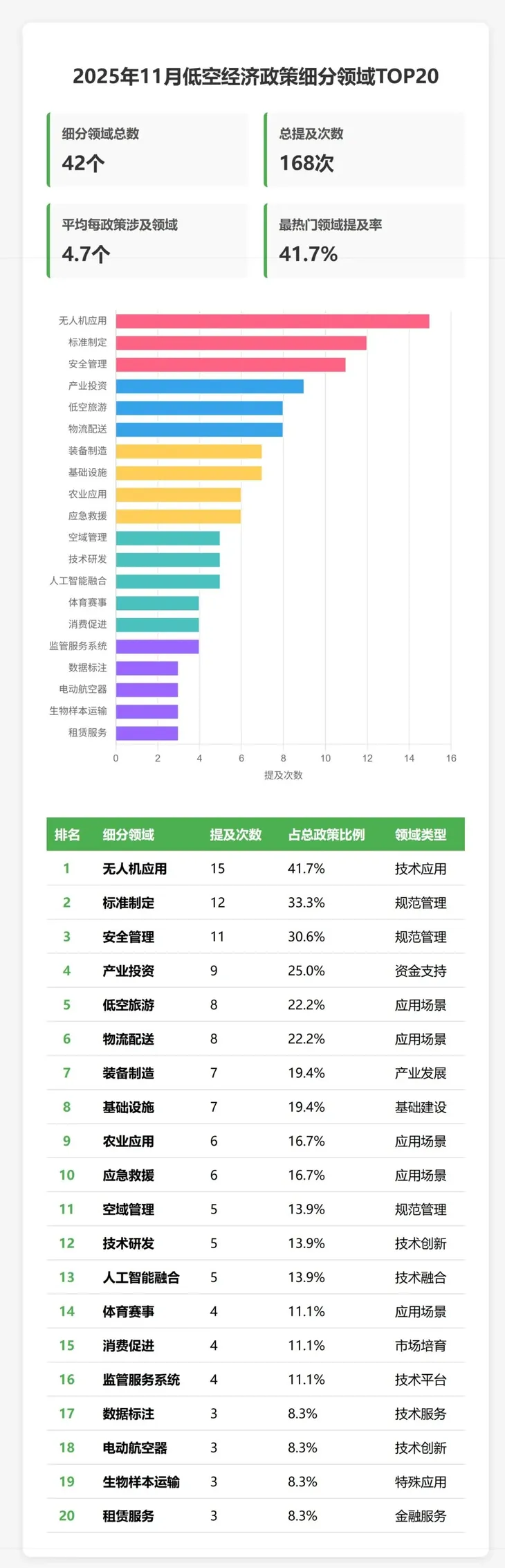 低空经济政策覆盖42个细分领域,总提及次数达168次,平均每政策涉及4.7个领域,显示政策的综合性和协同性特征。细分领域中,无人机应用以15次提及、41.7%的占比位居首位,成为政策关注的核心焦点;标准制定(12次,33.3%)和安全管理(11次,30.6%)紧随其后,反映出产业发展初期对规范管理的迫切需求。产业投资、低空旅游、物流配送等领域提及次数均达8次以上,构成政策支持的重点方向。
