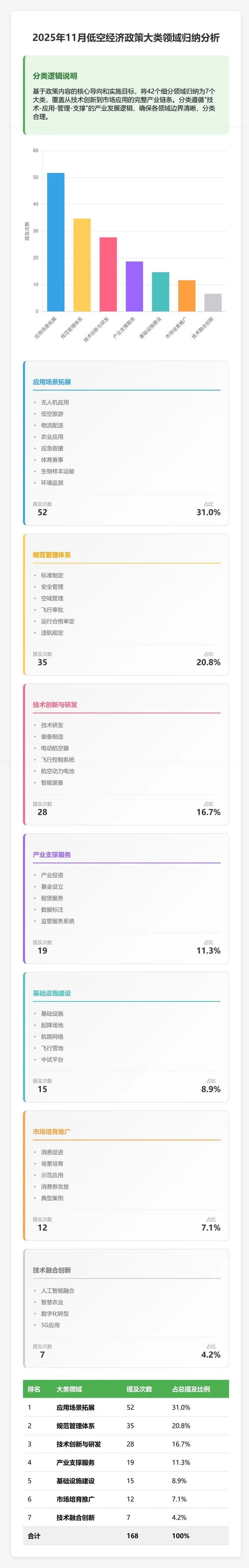 从大类归纳来看,应用场景拓展类政策提及52次,占比31.0%,成为第一大类,涵盖物流配送、农业应用、应急救援等多元场景,体现政策以应用为导向的发展思路。规范管理体系类政策提及35次,占比20.8%,包括标准制定、安全管理、空域管理等内容,为产业发展筑牢制度保障。技术创新与研发类政策提及28次,占比16.7%,聚焦装备制造、关键技术攻关等核心环节,强化产业发展的技术支撑。产业支撑服务、基础设施建设、市场培育推广和技术融合创新类政策依次跟进,形成完整的政策支持体系。