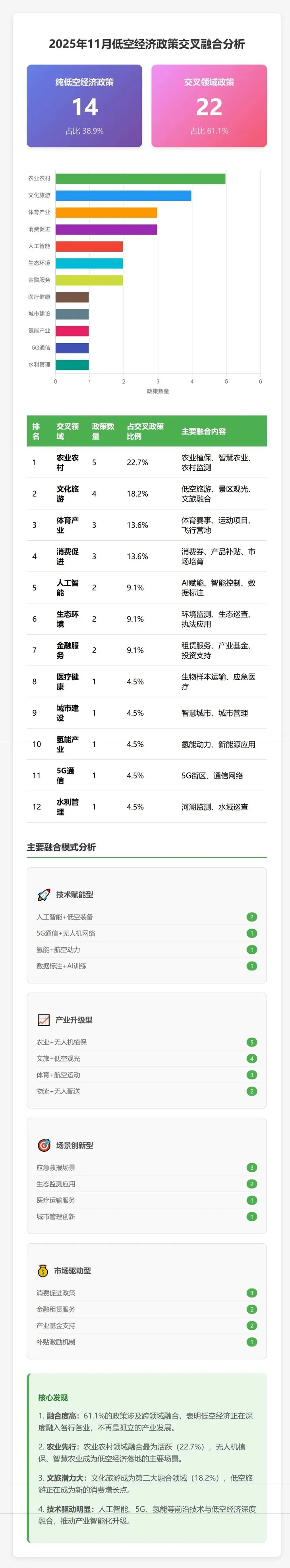 融合发展呈现三大特征:一是技术融合多元化,人工智能、5G、未来网络等新技术与低空装备制造、场景应用深度结合,提及次数达7次的技术融合创新类政策就是重要体现;二是产业边界模糊化,低空经济与文旅、农业、物流、应急等传统产业交叉渗透,形成低空旅游、农业植保、应急救援等新业态;三是管理服务一体化,政策既强调安全管理、空域管控等监管要求,又注重监管服务系统、数据标注等服务支撑,实现“管服并重”。这种交叉融合态势,推动低空经济从单一产业向复合型产业生态演进。