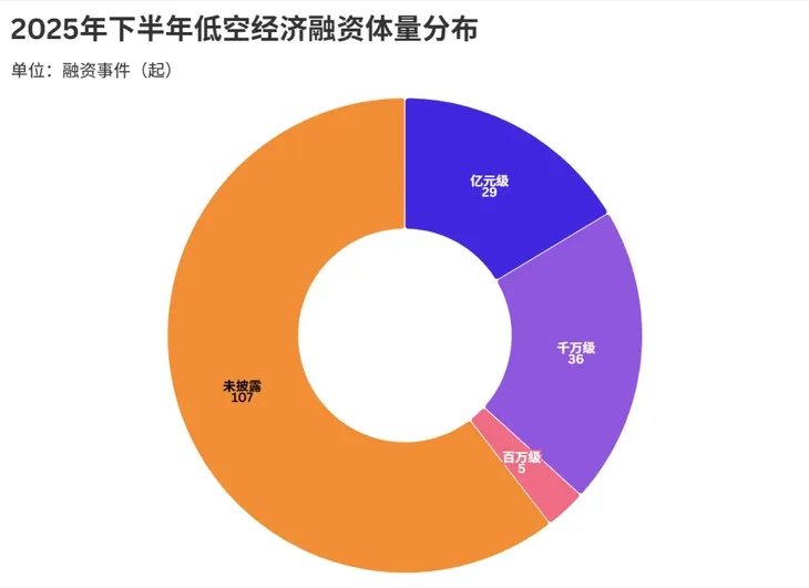 从披露数据来看,千万级融资事件以36起位居首位,成为支撑行业活跃度的核心力量。这一现象表明,大量处于成长期的低空经济项目正通过千万级资金注入,加速技术迭代与场景落地,覆盖无人机研发、低空基建、运营服务等多个细分赛道,反映出行业中腰部项目的蓬勃生命力。