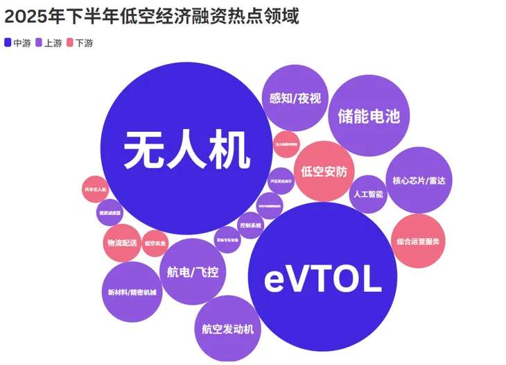 上游环节中,航电/飞控、航空发动机、储能电池、核心芯片/雷达等关键技术领域融资活跃,体现了资本对“卡脖子”技术突破的重视。感知/夜视、人工智能等技术的投入,则为低空飞行器的安全运行提供了底层支撑。