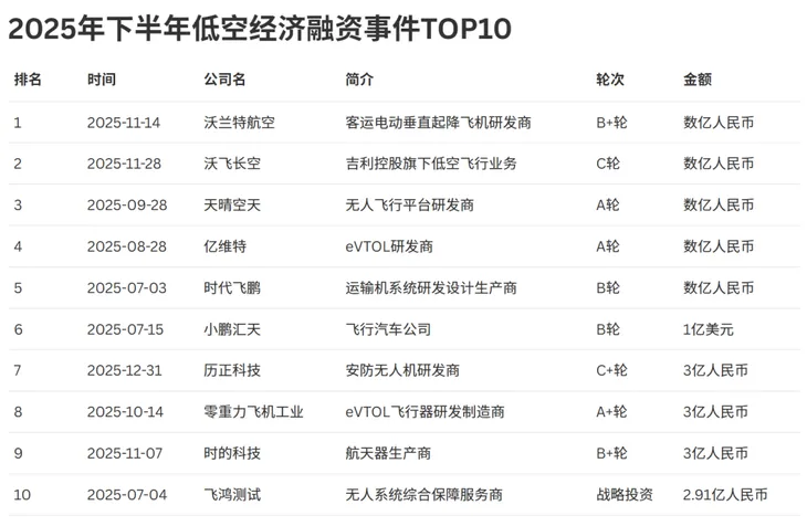 下半年的投融资数据不仅印证了市场对低空经济长期价值的坚定信心,更折射出行业从“政策驱动”向“运营驱动”转型的鲜明趋势——资本既聚焦eVTOL、无人机等核心装备领域,也加速向航电飞控、精密制造等上游关键环节渗透,为产业高质量发展注入充沛动能。