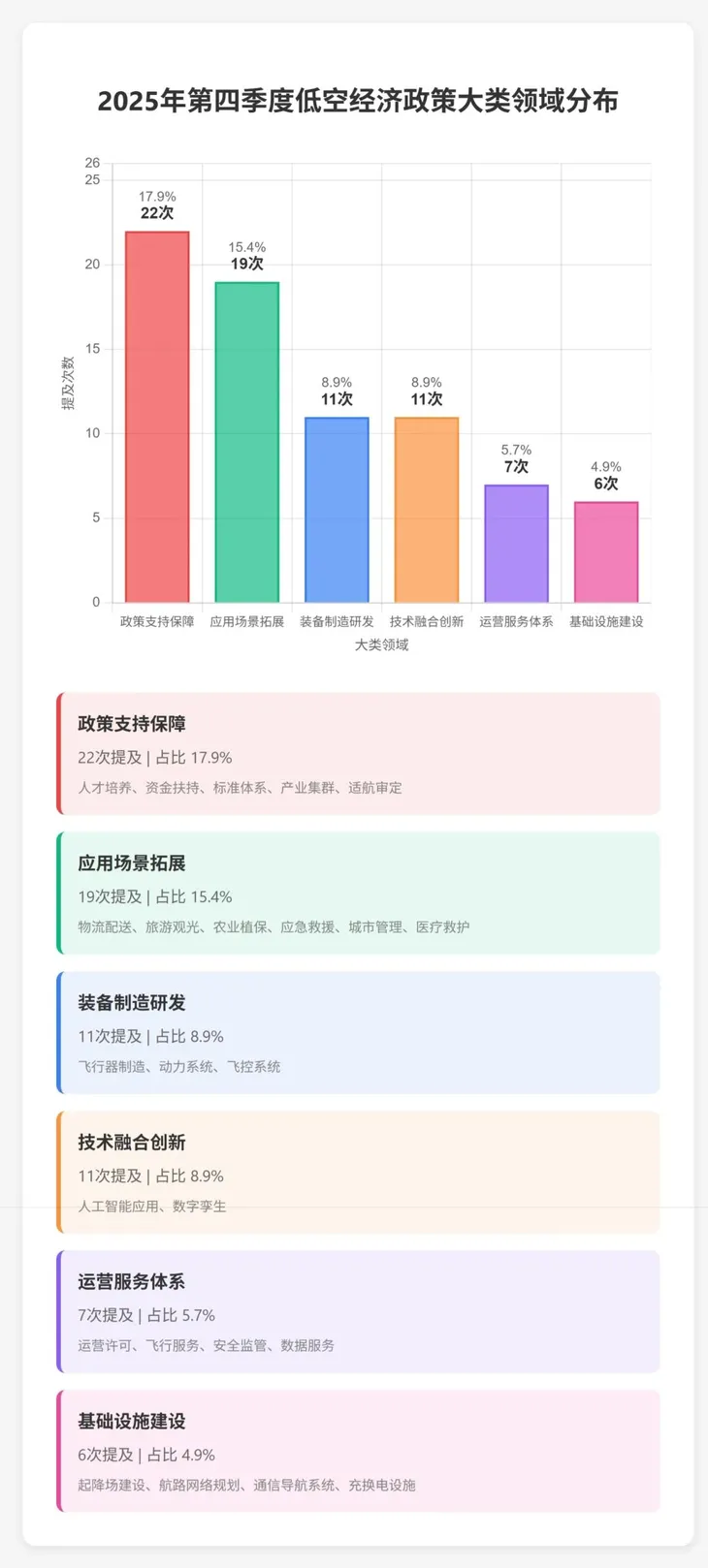 装备制造研发类和技术融合创新类均为11次提及,占比均为8.9%。前者聚焦飞行器制造、动力系统、飞控系统等硬件领域,后者强调人工智能、数字孪生等技术赋能。运营服务体系类7次提及,占比5.7%,涵盖运营许可、飞行服务、安全监管、数据服务等关键环节。基础设施建设类6次提及,占比4.9%,虽然提及频次不高,但起降场建设、航路网络规划、通信导航系统等均为产业发展的基础性工程,需要长期持续投入。