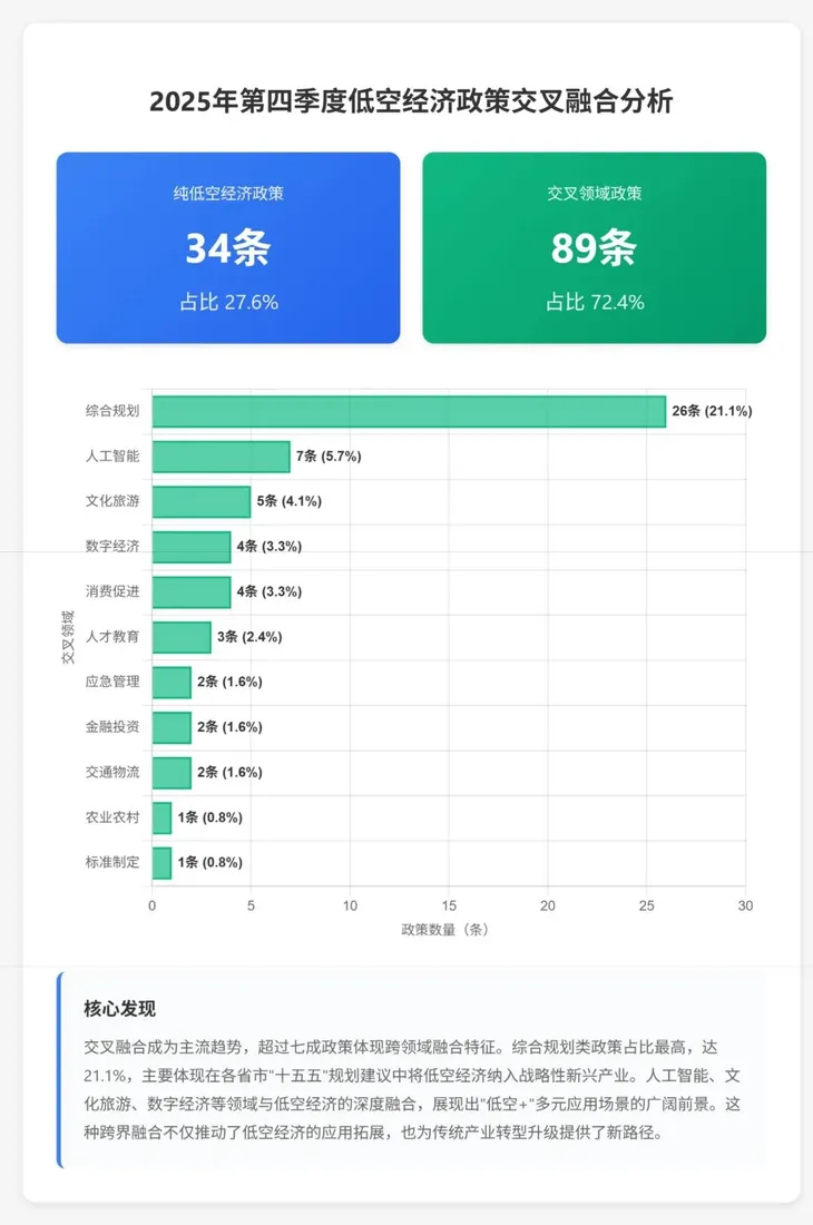 第四季度政策的一大显著特征是交叉融合趋势明显,89条政策属于交叉领域政策,占总数的72.4%,而纯低空经济政策仅34条,占比27.6%。这一数据表明,低空经济正在突破单一产业边界,与多个领域实现深度融合,形成"低空+"的发展格局。这种跨界融合不仅拓展了低空经济的应用场景,也为传统产业转型升级注入了新动能。