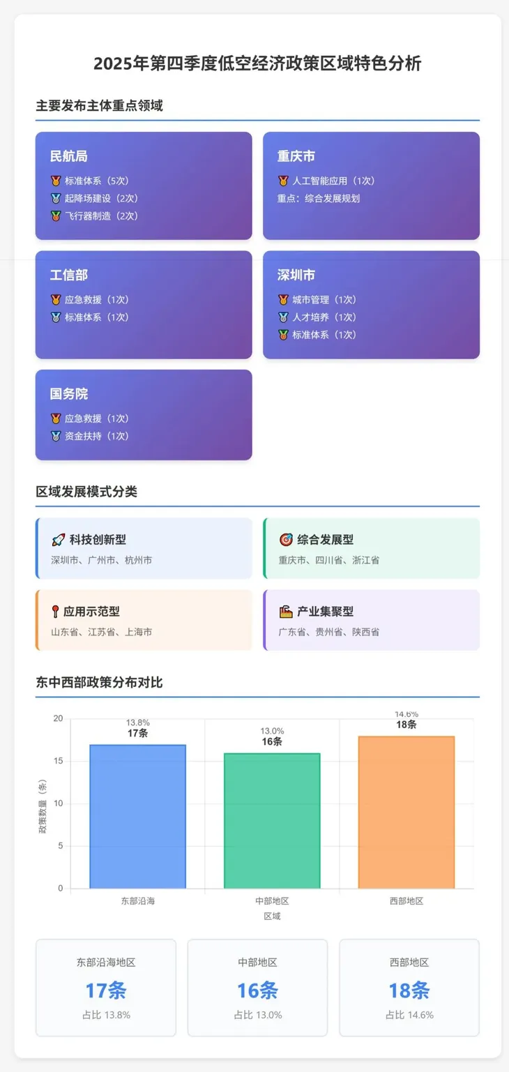 第四季度政策呈现出鲜明的区域特色,不同地区根据自身产业基础、资源禀赋和发展阶段,形成了各具特色的发展模式。从东中西部分布来看,西部地区以18条政策占比14.6%位居首位,东部沿海17条占比13.8%,中部地区16条占比13.0%,三大区域政策数量基本持平,显示低空经济发展已实现全国性布局,不再是少数发达地区的"专利"。这种均衡发展态势,既得益于国家战略的引领,也反映出各地对低空经济发展机遇的高度重视。