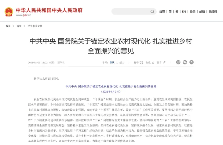 2月3日,《中共中央 国务院关于锚定农业农村现代化 扎实推进乡村全面振兴的意见》正式发布。作为“十五五”规划开局之年的首个中央一号文件,这是党的十八大以来第14个持续聚焦“三农”工作的中央一号文件,为新阶段农业农村现代化建设擘画了清晰蓝图,明确了以发展农业新质生产力为重要抓手,扎实推进乡村全面振兴的核心路径。
