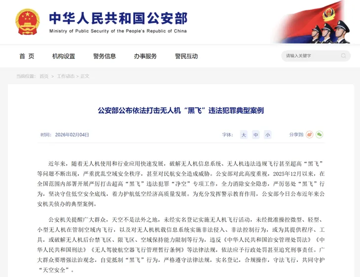 为坚决守住低空安全底线,护航低空经济高质量发展,公安部自2025年12月起,在全国范围内部署开展严厉打击超高“黑飞”违法犯罪“净空”专项工作,全力消除安全隐患、严惩违法犯罪行为。近日,公安部公布近年来侦办的8起无人机“黑飞”违法犯罪典型案例,充分发挥警示教育作用,引导广大群众依法合规使用无人机。