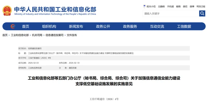 2月10日,工业和信息化部、中央网信办、中央空管办、国家发展改革委、中国民航局五部门联合印发《关于加强信息通信业能力建设 支撑低空基础设施发展的实施意见》(以下简称《意见》),明确通过持续提升信息通信业综合供给能力,为我国低空经济发展筑牢基础设施根基,推动低空经济健康有序发展、培育新质生产力。